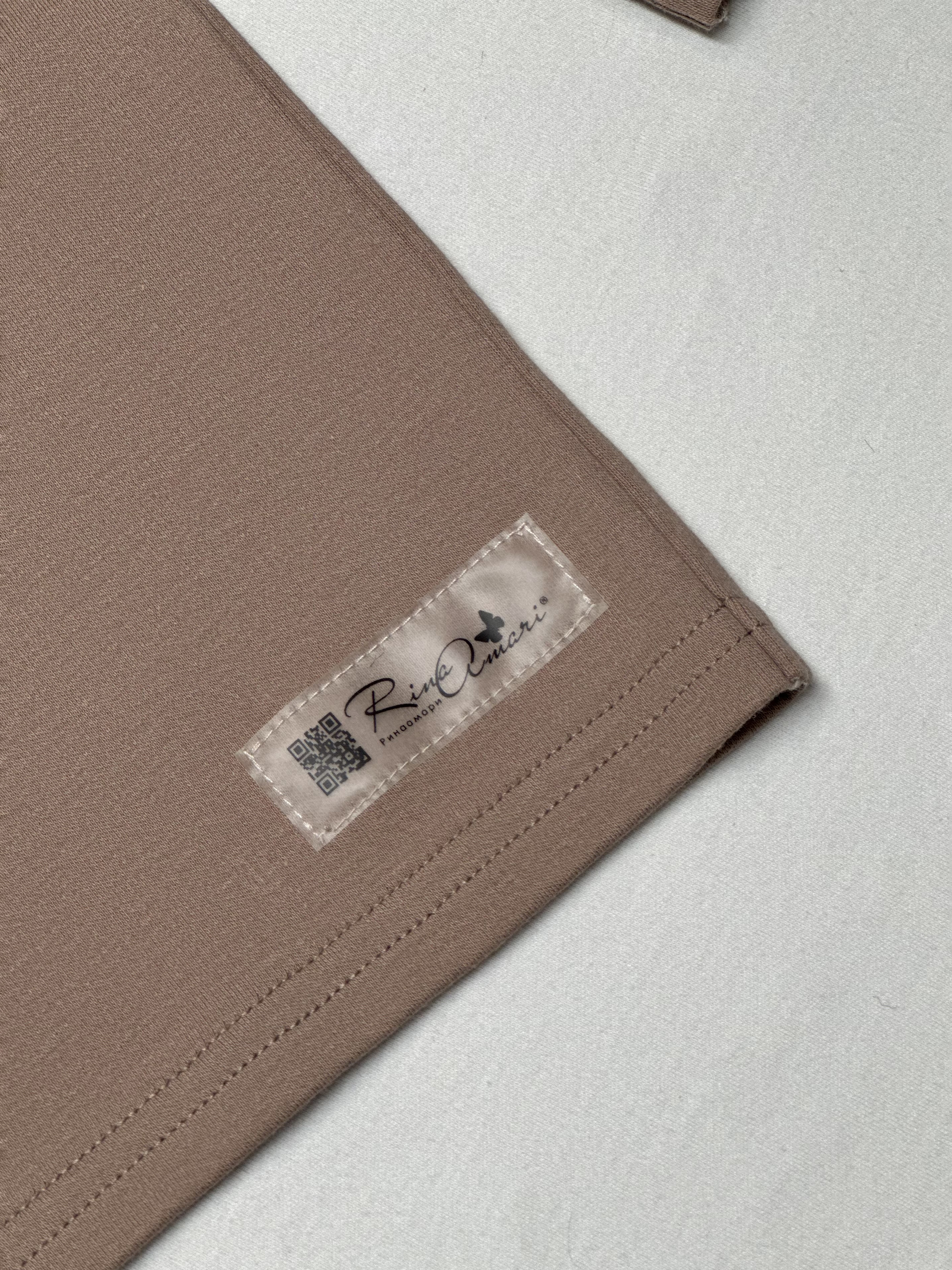 Лонгслив изготовлен из трикотажного хлопка под названием интерлок пенье в нейтральных цветах. Интерлок пенье – это плотный трикотаж двойного плетения хлопчатобумажных нитей наивысшего качества. Одежда из такого материала долго носится, практически не мнётся, хорошо сохраняет цвет и форму. Плюсы материала: